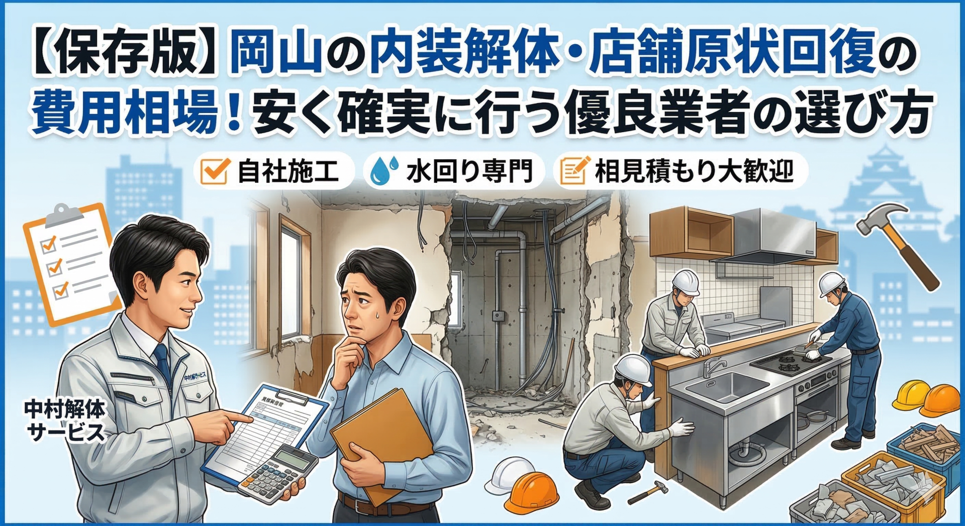 本記事では、岡山の内装解体・店舗原状回復のリアルな費用相場から、コストを押し上げる要因、そして退去費用を劇的に安くするための裏技までを徹底的に解説いたします。当社の強みである水回り設備の専門知識を生かしたコストダウンの手法や、優良な解体業者の見極め方についても詳しくお伝えしますので、ぜひ最後までご覧いただき、スムーズな店舗退去にお役立てください。